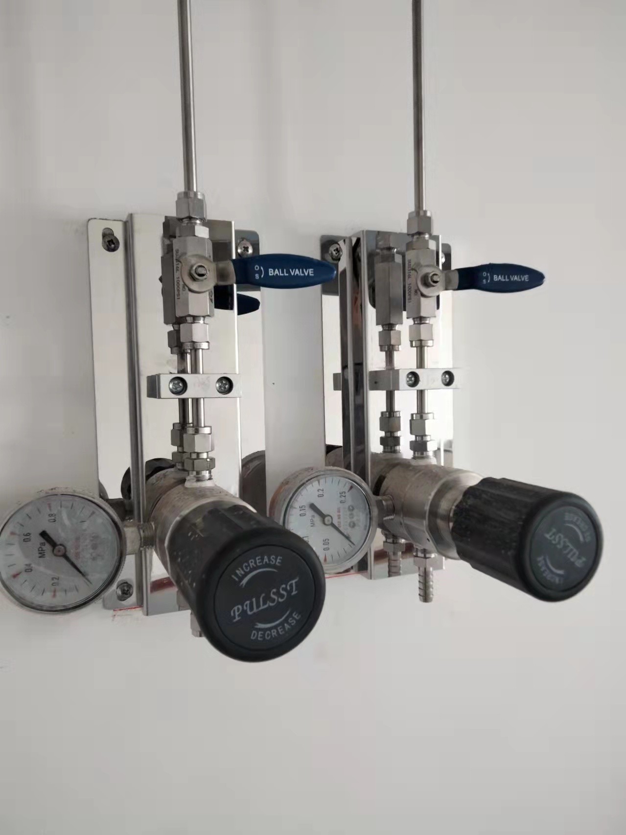 再次是解決氣瓶壓力的問(wèn)題。每種氣體可以將多瓶氣體并聯(lián)然后通過(guò)一個(gè)出口統(tǒng)一減壓后運(yùn)送氣體至使用點(diǎn)。因?yàn)闅馄块g是相對(duì)獨(dú)立的,整個(gè)氣路系統(tǒng)壓力最大的地方也是氣瓶出口處,因此這種方式將氣瓶壓力可能發(fā)生的危險(xiǎn)縮小至氣瓶間內(nèi),可對(duì)人體及儀器的傷害可降到最低。