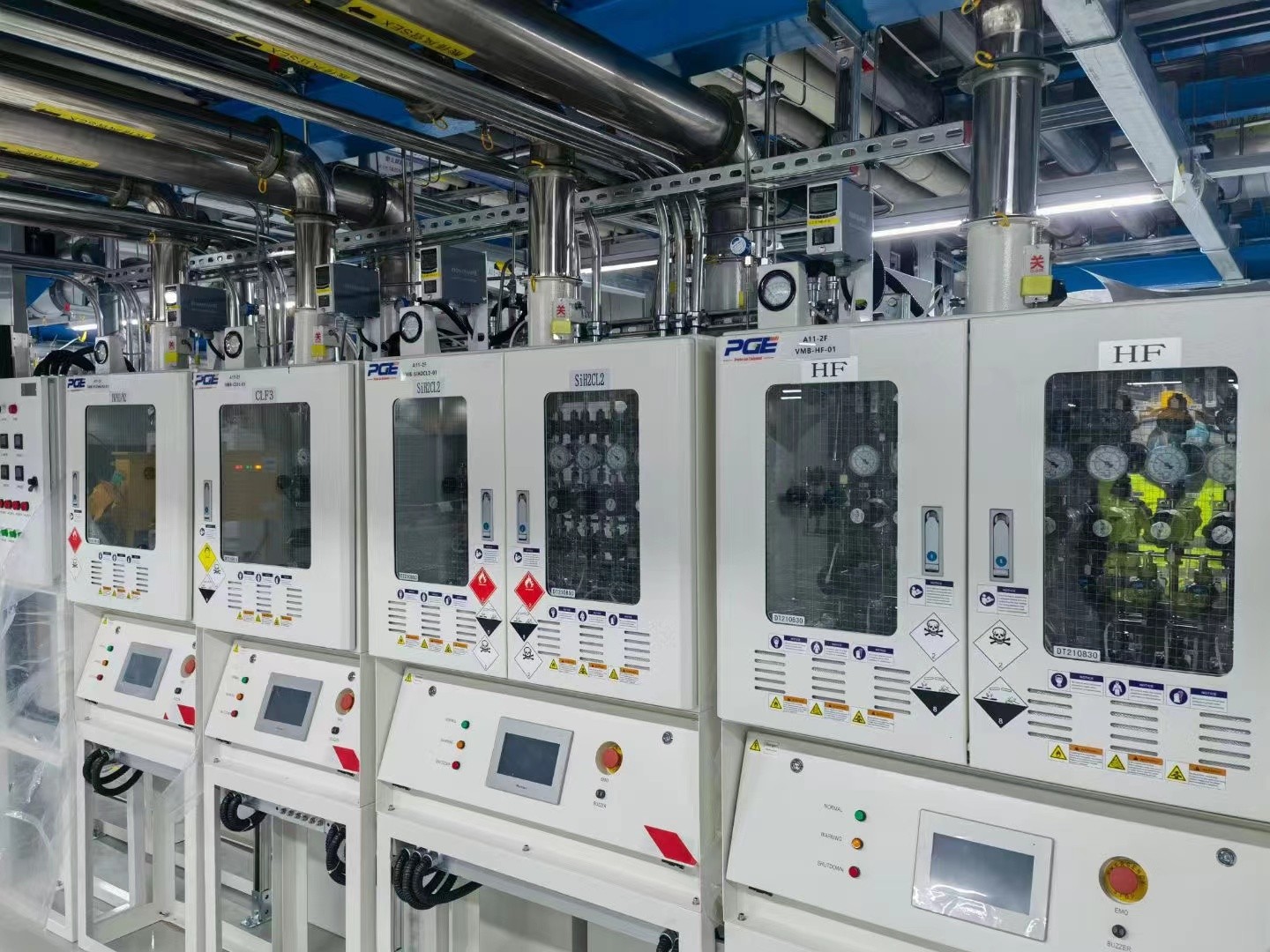 特種氣體的供應方式截至目前為止,幾乎皆用鋼瓶的方式進行。一般常用的為高壓鋼瓶,依其填充的氣體特性有分為氣態和液態兩種。一般氣體依液態儲存于鋼瓶內,瓶內壓力較高,所以最佳方式是選用吸附式氣態鋼瓶,以氣體分子與吸附劑間的范德瓦力將氣體吸附于吸附劑孔隙中,其優點為供氣壓力低于一個大氣壓,無任何泄漏的危險,且供氣量為普通高壓鋼瓶的10倍,低蒸汽壓的氣體以液態儲存于鋼瓶內;針對易燃易爆,有毒性腐蝕性的氣體,常將鋼瓶至于特氣柜中,再通過管路將氣體供應至現場附近的閥箱,經過一系列的控制而后進入用氣點;一般惰性氣體以開放式的氣瓶架和閥盤供應。